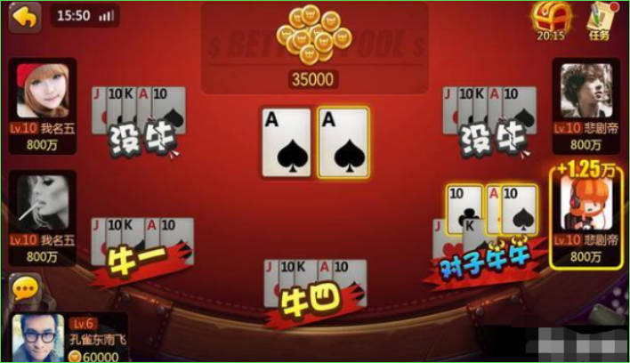 3、牛牛:5张牌中的任意3张加起来为10的倍数,且另外2张也为10的倍数(如5,6,9,10,J)。